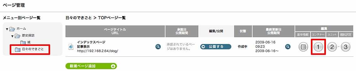 (1) 「ページ作成・削除」画面へ遷移し、左のメニューツリー(メニュー別ページ一覧)からブログメニューを選択します。